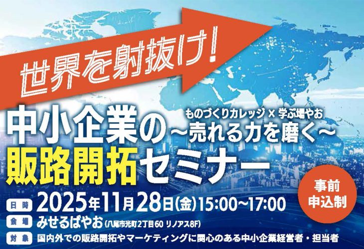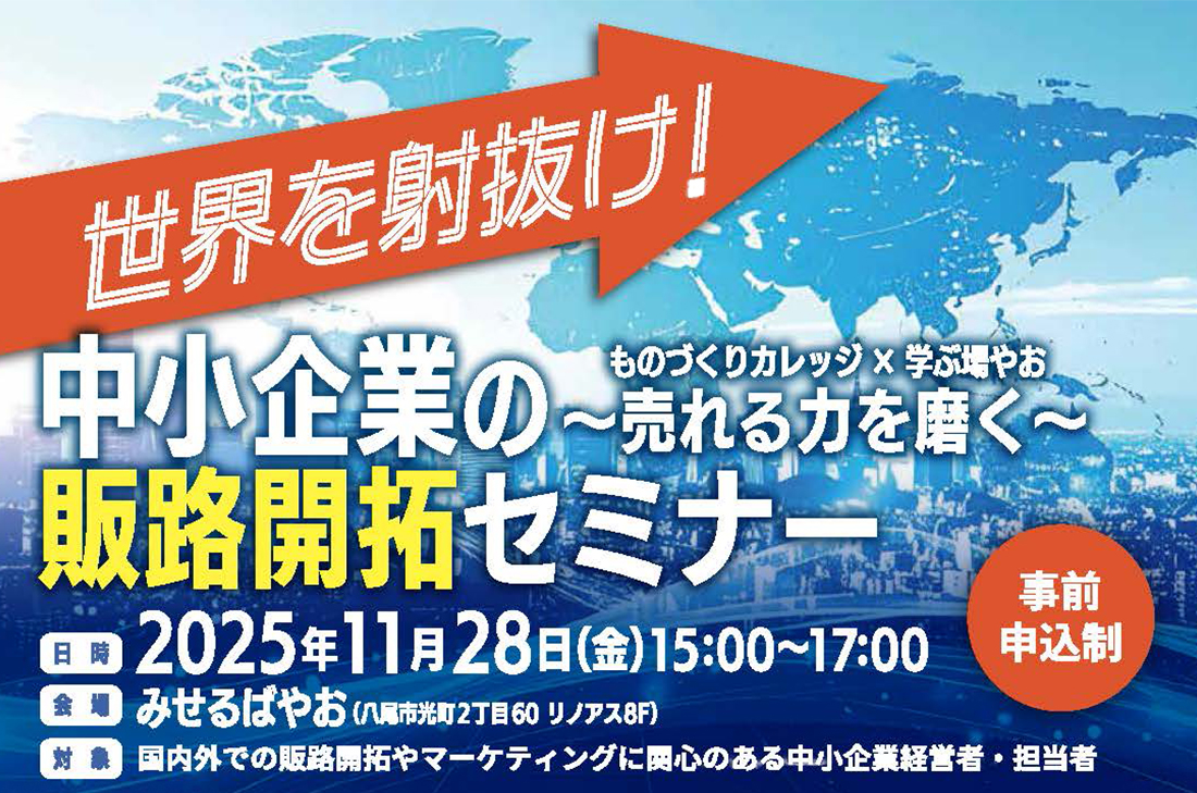 11月282025 イベント・ワークショップ 世界を射抜け! 中小企業の販路開拓セミナー ものづくりカレッジ×学ぶ場やお ~売... 【日時】 2025年11月28日(金)15:00~17:00 【会場】 みせるばやお (八尾市光町2丁目60 リノアス8F) 【対...