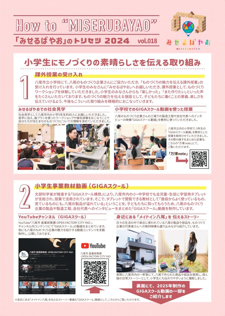 先人が我々に伝えてきたように、ものづくりの魂を次世代にも紡ぐため、そしてこの地域の魅力を後世の子どもたちにも伝えるために、中小企業の叡智を結集した「みせるばやお」(拠点施設)が2018年8月8日にオープンしました。