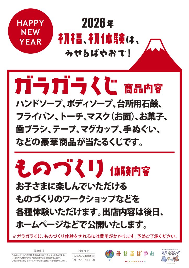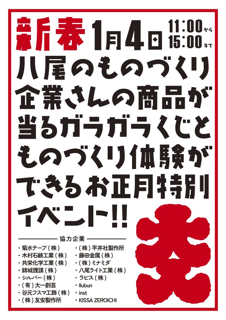 ものづくりのワークショップはもちろん、お正月ならでは、八尾のものづくり企業さんの商品がもれなく当たるガラガラくじも開催!