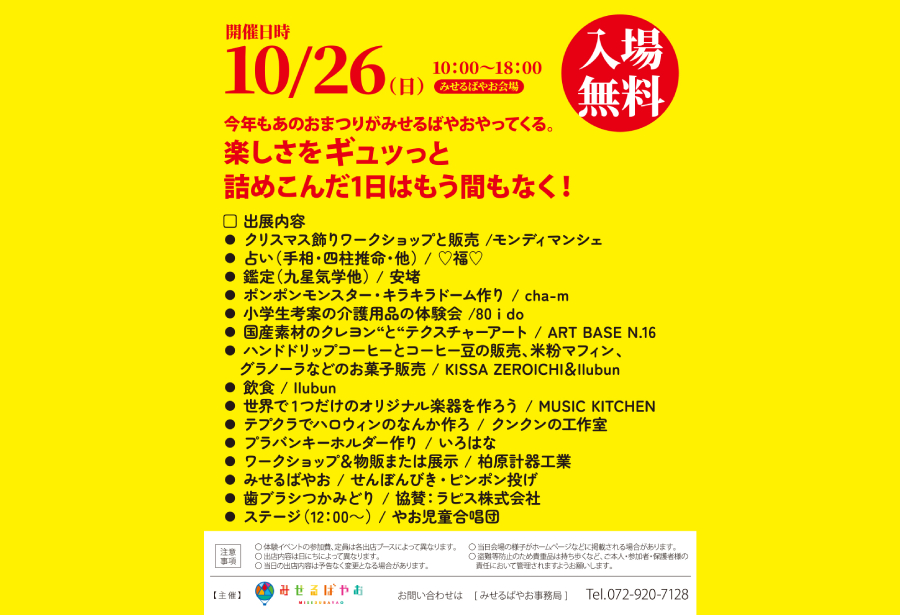 10月262025 第48回八尾河内音頭まつりinみせるばやお 日時:2025年10月26日 (日) 場所:みせるばやお LINOAS 8階 時間:10時00分~18時00分 🏮入場無料🏮 八尾ではお馴染みの八尾河内音頭まつりが今年も開催!! ものづくりのワークショップはもちろん、お菓子などの販売から歯ブラシのつかみどり、せんぼんびきややお児童合唱団による合唱ステージまで!! 出店ブース目白押しでお祭りムードの賑やかな雰囲気を、お子様だけでなくご家族でお楽しみいただけます。 10月後半のお出かけはみせるばやおに決まりっ!! 出店店舗一覧 ※順不同 店舗 出店内容 クンクンの工作室 テプクラでハロウィンのなんか作ろ🎃 モンディマンシェ クリスマス飾りワークショップ🎄 cha-m ①ポンポンモンスターをつくろう! ②キラキラドーム作り! MUSIC KITCHEN 世界で1つだけのオリジナル楽器を作ろう♪ いろはな プラバンキーホルダー作り 80 i do 小学生考案の介護用品の体験会 ♡福♡ 手相・四柱推命🔮他 安堵 九星気学🔮他 KISSA ZEROICHI&Ilubun ハンドドリップコーヒーとコーヒー豆の販売 米粉マフィン、グラノーラなどのお菓子販売 ART BASE N.16 国産素材のクレヨンとテクスチャ―アート 柏原計器工業 ウォーターフェスティバル~体験しながら水の仕組みを学ぼう~ みせるばやお せんぼんびき・ピンポン投げ 協賛:ラピス株式会社 歯ブラシつかみどり ※体験イベントの参加費、定員は各出店ブースによって異なります※ ★ステージ やお児童合唱団 12:00~ 注意事項 〇当日の出店内容は予告なく変更となる場合があります。 〇当日会場の様子がホームページなどに掲載される場合があります。 〇盗難等防止のため貴重品は持ち歩くなど、ご本人・参加者・保護者様の責任において管理されますようお願いします。 【主催】みせるばやお お問い合わせは[みせるばやお事務局]072-920-7128