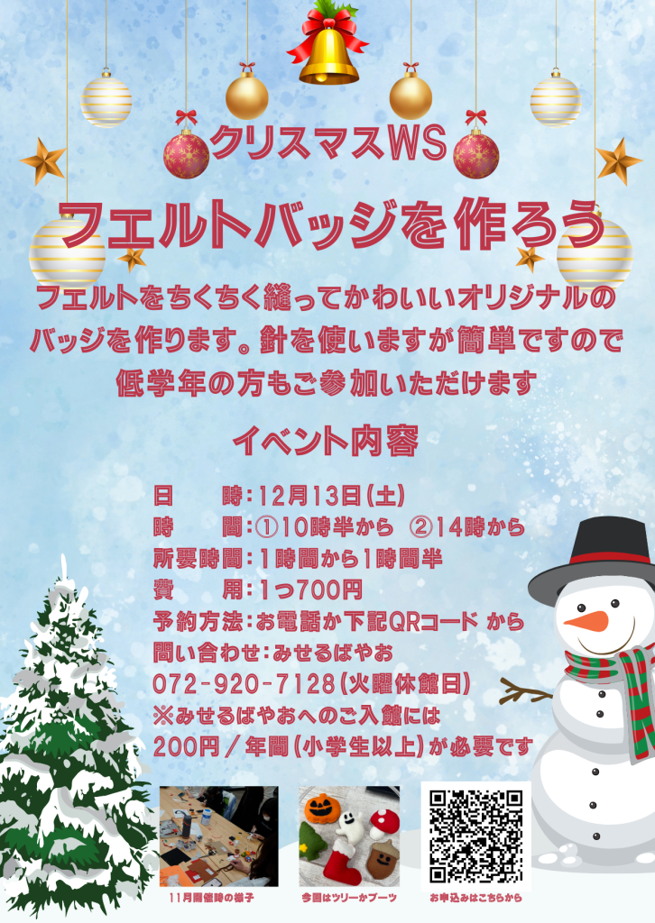 フエルトの縫ってバッジをつくります。今回はもみの木(ツリー)とブーツのどちらかを選んでいただけます。 前回は男の子や大人の方にも参加していただき素敵な作品がたくさんできました。ステッチから丁寧に指導いたしますので、縫い方を知らなくても不器用さんでも丁寧に一緒に作りますので安心してご参加ください。低学年の方も大歓迎です。当日は「いちどあそべば」開催日ですので入館料は無料です。こちらのWSは要予約です。定員に達した時点でご予約は締め切らせていただきます。